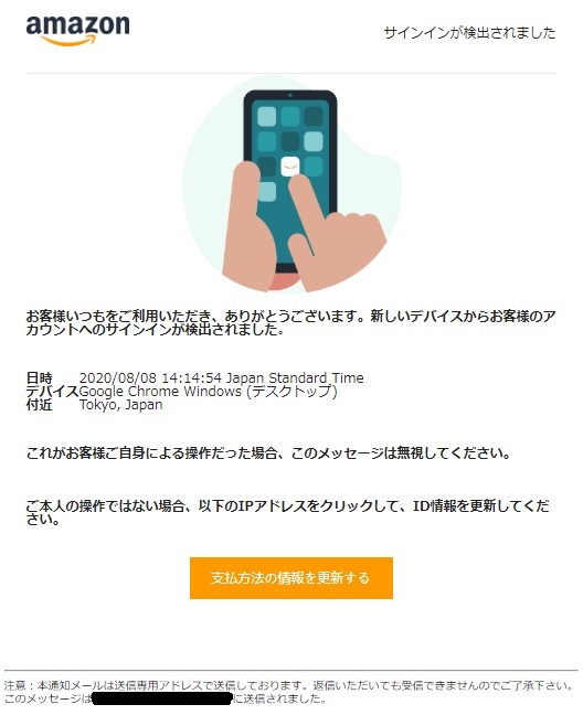 お客様いつもをご利用いただき、ありがとうございます。新しいデバイスからお客様のアカウントへのサインインが検出されました。